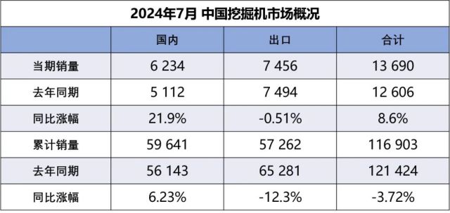 据中国工程机械工业协会对挖掘机主要制造企业统计,2024年7月销售各类挖掘机13690台,同比增长8.6%,其中国内6234台,同比增长21.9%;出口7456台,同比下降0.51%。2024年1—7月,共销售挖掘机116903台,同比下降3.72%;其中国内59641台,同比增长6.23%;出口57262台,同比下降12.3%。2024年7月销售电动挖掘机2台(6吨以下1台,18.5至28.5吨级1台)。
