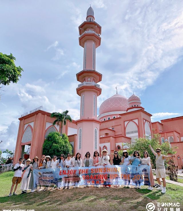 夜晚,大家尽情享用当地特色水果和美食,各种热带水果清甜爽口,带来丝丝清凉。经过一夜的休息,第二天团队来到了美丽的沙巴大学粉色清真寺,依山傍海,环境优美。整座建筑都是粉色外墙,浪漫又具有风情,成为合影留念的绝佳场所。随后,团队前往水上清真寺,这是马来西亚夕阳景色最壮丽的教堂。每当夕阳西下,落日余晖将整个建筑披上金色外衣,湖面上的倒影与建筑本身相映成趣。站在白色栈桥上拍摄整个建筑或者拍摄倒影都是绝佳的选择。